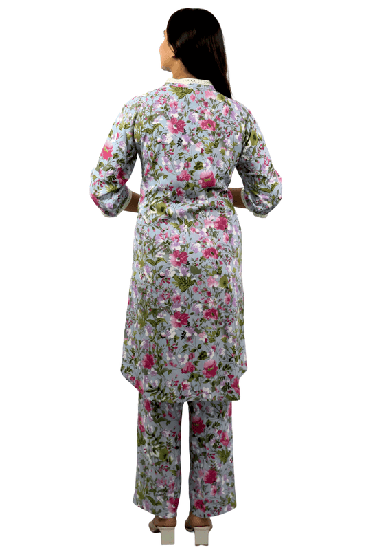 Soft Cotton Printed Sky Blue Flaired Kurta Set